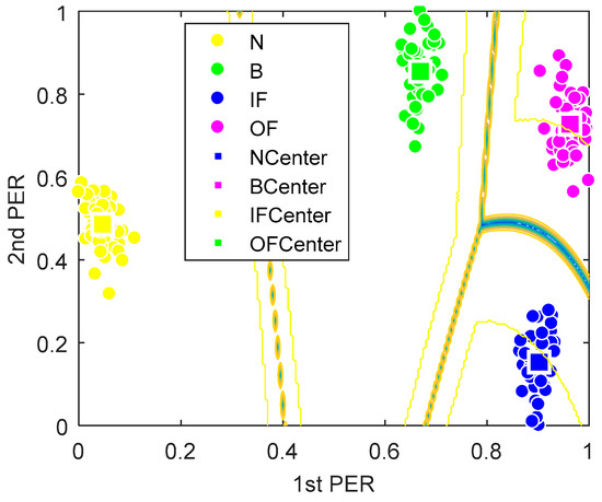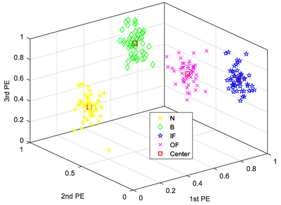 According to the data of four fault types, the number of cluster centers is initially selected as c = 4. The weighted index m = 2, and the iteration termination tolerance c = 0.0001. The results of the GG clustering analysis for four sets of permutation entropy data of eigenvectors obtained by LDA show that the four types of data are clustered near the clustering center, and they are closely clustered (shown in Figure 4 and Figure 5). There is no aliasing phenomenon among them, and the distance between them is large.