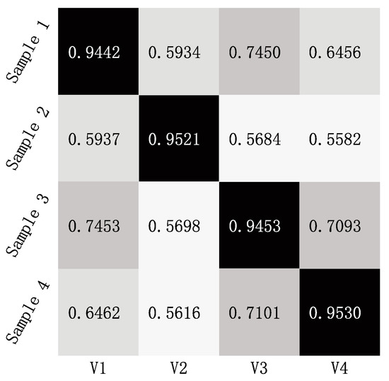 The clustering centers of data are shown in Table 3. The clustering centers of the four signal types are V1–V4 in turn. Figure 6 shows the average Hamming approach degree of each sample set. The Hamming approach degree of Group 1 relative to V1 is 0.9442, close to 1, and larger than that of the other three groups. Therefore, Group 1 belongs to V1. Similarly, Group 2 belongs to V2, Group 3 belongs to V3, and Group 4 belongs to V4. Therefore, this proposed method has good performance in the fault diagnosis of rolling bearings.