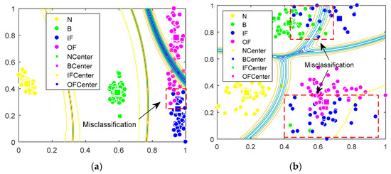 (a) The FCM clustering contour for PE. (b) The GK clustering contour for PE.