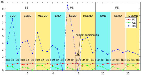 According to the fault diagnosis method proposed in this paper, if we want to analyze a piece of an original fault diagnosis signal, first, we need to perform empirical mode decomposition, getting the signal entropy value. Then, we perform LDA dimensionality reduction, which will facilitate the subsequent cluster analysis to realize the classification of signal data. In this process, there are three methods of empirical mode decomposition, such as EMD, EEMD, and MEEMD. Similarly, there are three types of entropy values, such as fuzzy entropy, sample entropy, and permutation entropy. Clustering methods usually include FCM clustering, GK clustering, and GG clustering. In the analysis and discussion above, we control the variable method to keep two processes unchanged and compare the third process to determine the optimal approach. However, this analysis is not comprehensive enough, because there are a total of 27 ways to obtain fault diagnosis through the above process. Through the above analysis, it is not fully proved that the optimal method we selected is the best among the 27 types. To confirm the superiority of our proposed fault diagnosis method, we analyze each combination, and the clustering index of each combination is obtained as shown in Figure 10.