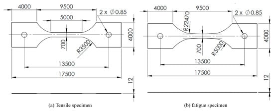 The shape and dimension of the specimens (μm). (a) Tensile specimen (b) Fatigue specimen.