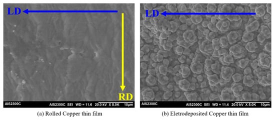Copper thin film surface image by process method from SEM (Scanning Electron Microscope). (a) the surface image of rolled copper (b) the surface image of electrodeposited copper.