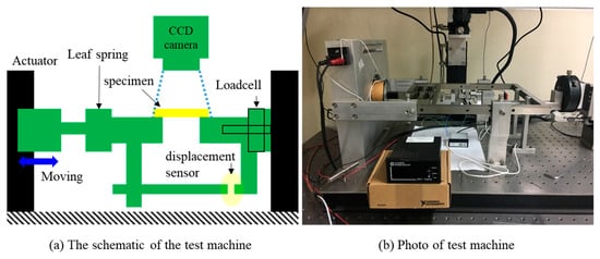 We organize a test machine for both the tensile and fatigue tests as shown in Figure 4. The test machine consists of a force-translator, a load measurement sensor such as a load cell, and a displacement measurement sensor. In addition, the test machine was equipped with a 12x zoom CCD for acquiring the surface image of specimen during the tensile or fatigue tests.
