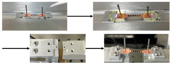 The specimen of thin film is difficult to handle when performing tensile and fatigue tests. The thin film may frequently be fractured before the experiment. In addition, it is difficult to align the specimen with loading direction. Therefore, in this study, the specimen is aligned and fixed as shown in Figure 5. For fixing and aligning the thin film, we designed the aluminum plates and the specimen is mounted with these plates to make the specimen easier to handle. In addition, to align the specimen, the holes in the same position on the aluminum plate and the tester are made and pins are fixed.