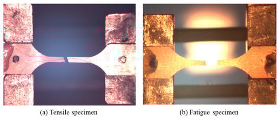 First, as shown in Figure 1a, the specimen used for the tensile test is designed in dog-bone type. The total length is 17,500 μm and the reduced section is designed to be 5000 μm in length and 700 μm in width. There are holes with a diameter of 850 μm in the specimen fixed part and the distance between the holes is 13,500 μm. The role of the hole is to fix the specimen by inserting a pin when fixing the specimen. Second, as shown in Figure 1b, the specimen used for fatigue testing is designed in hour-glass type. The total length is 17,500 μm, the reduced section has an arc of radius 22,470 μm, and the width of reduced section is 700 μm. The specimen of tensile and fatigue have all 12 μm thicknesses.