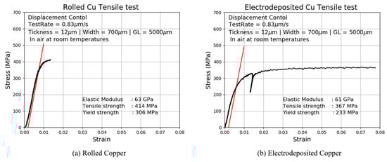 The unloading test is essential for obtaining the elastic modulus more accurately. Therefore, the unloading test is applied to the electrodeposited copper around the strain 0.015, as shown in Figure 9b. However, the unloading test cannot be applied on the rolled copper because it had a brittle fracture.