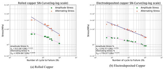 Figure 10 is a stress-life curve which is shown the relationship between amplitude stress and life for the fatigue test results of rolled and electrodeposited copper depending on the process. In addition, stress-life curves were obtained for amplitude stress and alternating stress. Alternating stress was calculated by applying Goodman’s fatigue equation as shown in Equation (2) [17]. It was obtained using experimental data repeated three times for each target life level, and the error of experimental data was small. Since copper is a nonferrous metal material, the fatigue limit cannot be obtained. However, the fatigue test was performed up to 500,000 cycles with a high cycle [18].