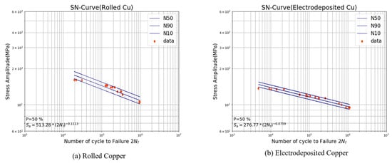 In this study, fatigue life equations in the finite-life region are obtained and analyzed. In Table 2, the results of the fatigue life equations of the rolled and electrodeposited copper and the fatigue life equations according to the plating method of [12] are presented as amplitude stress and alternating stress. Types A, B, and C are the results of fatigue tests with constant 0.5 of tensile strength at mean stress. Therefore, in order to compare the results of the rolled and the electrodeposited copper which are the experimental results of this study, the fatigue life equation for alternating stress was obtained. As a result, fatigue strength coefficients of 910 MPa, 1191 MPa, and 1743 MPa were obtained for each plating type, and the fatigue strength exponents were −0.08955, −0.10913, and −0.15072, respectively. The fatigue properties are different according to the plating method, and it can be seen that the fatigue strength is the highest when the double-plating is performed.