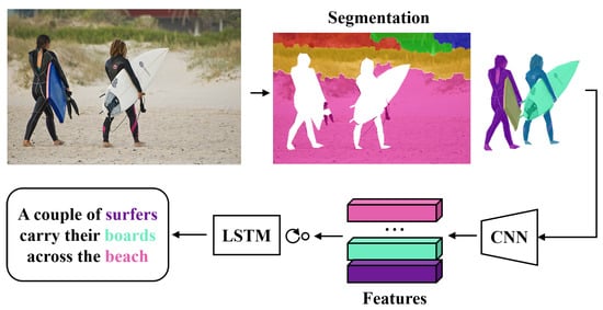 - Fang, H.; Gupta, S.; Iandola, F.; Srivastava, R.K.; Deng, L.; Dollár, P.; Gao, J.; He, X.; Mitchell, M.; Platt, J.C.; et al. From captions to visual concepts and back. In Proceedings of the IEEE Conference on Computer Vision and Pattern Recognition, Boston, MA, USA, 7–12 June 2015; pp. 1473–1482. [Google Scholar]