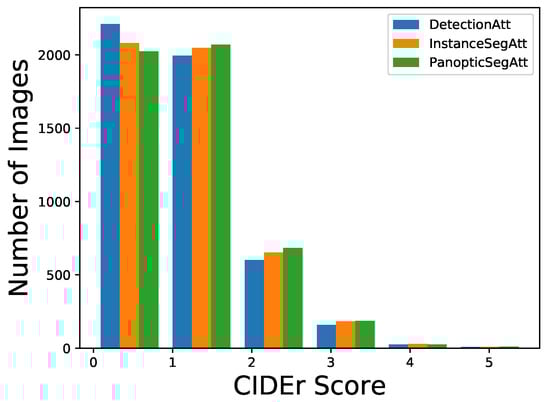 Histogram of CIDEr scores of DetectionAtt, InstanceSegAtt, and PanopticSegAtt.