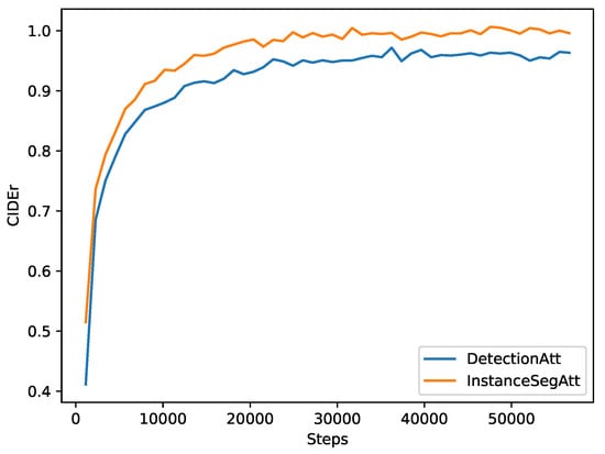 Comparison of CIDEr scores on the validation set for InstanceSegAtt and DetectionAtt during 50 epochs’ training.
