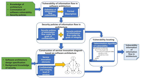 In this paper, we first propose a definition and formal description of information flow vulnerability in software architecture. Then, security policies of information flow in architecture are given based on Bell–LaPadula model and Biba model. After that, the construction method for service invocation diagram of software architecture is proposed based on graph theory. Finally, we designed and implemented a corresponding algorithm for locating vulnerabilities. The framework of the research method is shown in Figure 1, where green blocks represent background and domain knowledge needed in this research, rounded rectangles represent research that needed to be conducted, blue rectangles represent the results and outputs of each part of the research, gray rectangles represent the analysis results.