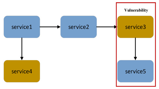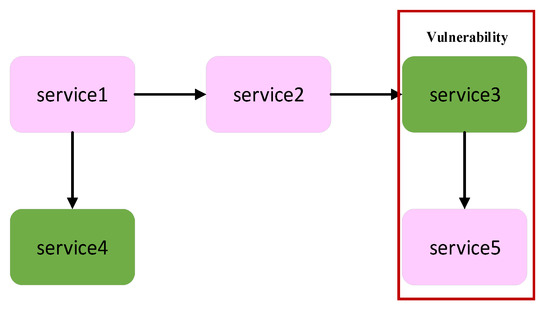 Similarly, in Figure 3, we can see that the architecture is composed of service 1 to service 5. The rectangular boxes represent services. The color represents the security level of each service, in which pink represents high security level while green represents low security level. The boxes with the same color represent services with the same security level. The symbol “→” represents the interaction between services and the direction of data flow. In Figure 3, the part inside the red box is the vulnerability of information flow in software architecture under integrity policies.