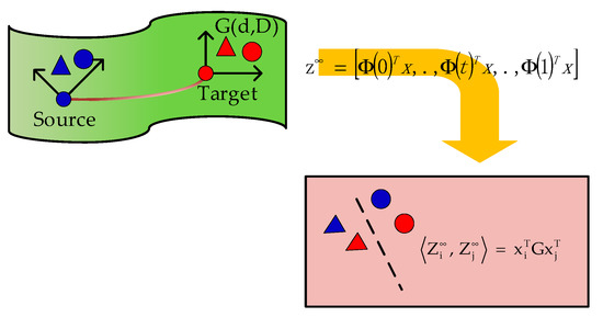 As shown in the Figure 3, GFK tries to embed the dimension subspace , after dimensionless reduction of the source domain and target domain into the manifold G. is the source domain representation of manifold G, is the target domain representation of manifold G, and the geodesic flow between and is equivalent to transforming the original feature space into an infinite dimension space, reducing the drift phenomenon between domains. The parameterization is shown as follows: