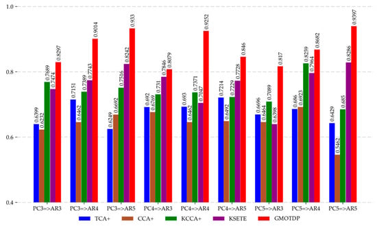In order to investigate the performance of the proposed algorithm in this paper, GMOTDP is compared with the existing state-of-the-art defect prediction methods, such as TCA+ [23], CCA+ [8], KCAA+ [13], and KSETE [16]. TCA+ and CCA+ are benchmark comparison methods for heterogeneous defect prediction. KCAA+ and KSETE are new heterogeneous defect prediction methods in 2017 and 2019. All methods use logistic regression as the classifier. In the experiments, one project was selected as the target project, and the projects in different datasets were used as the source project for heterogeneous prediction. The area under the working characteristic curve (AUC) of the subjects was used as the evaluation index of the prediction model. The value of AUC ranged from 0 to 1, which is larger, the classification effect of the model is better. For example, six forecasting cases can be carried out for a given SOFTLAB database, when AR3 is selected as the target project. They are called PC3 ≥ AR3, PC4 ≥ AR3, MW1 ≥ AR3, EQ ≥ AR3, JDT ≥ AR3, LC ≥ AR3. Because GMOTDP involves randomness when dealing with class imbalance and feature selection, the average results of 50 repeated experiments were counted for each case to reduce the influence of randomness on the experimental results.