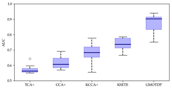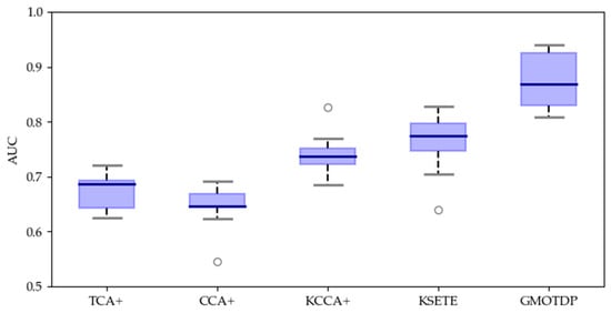 Table 4 shows the AUC values of GMOTDP compared with the other four methods when the source and target projects have common features. We selected datasets from NASA and SOFTLAB as source and target projects, respectively. Figure 4 graphically displays Table 4 for a more intuitive display and comparison of the predicted results. It can be seen from Figure 4 and Table 4 that the performance of GMOTDP is better than other methods, and the AUC average value of the prediction results of the other four methods is improved by 0.1981, 0.2305, 0.1331, and 0.1106, respectively. It can be seen that the prediction effect of GMOTDP is better than the other four methods from the boxplot representation of Figure 5.