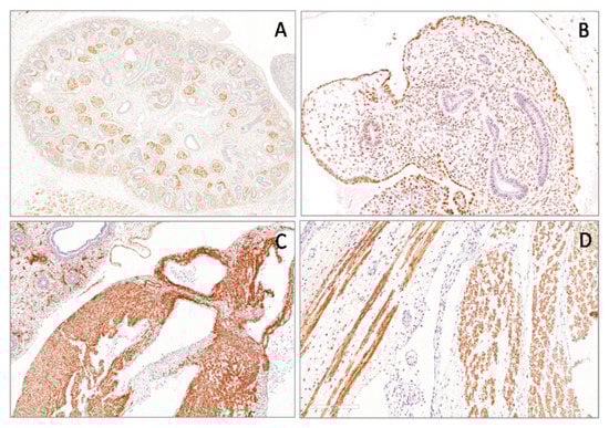 During the early phases of development (from 6 wGA) embryonic myoblasts forming myotomes exhibit strong cytoplasmic staining for WT1. Moreover, in both primary and secondary myotubes of the developing muscles, WT1 is strongly and diffusely expressed in the cytoplasm of these cells. From 20 wGA, WT1 cytoplasmic expression becomes more heterogeneous, ranging from focally strong to weak or absent within the same muscle fiber (mosaic-type expression) (Figure 1). WT1 nuclear immunoreactivity is lacking in skeletal muscle during all phases of myogenesis [41]. Several studies have shown that WT1 is crucial for heart development [60,61], and it may also be involved in the proliferation of cardiac myocytes. In addition, WT1 plays a key role in the conversion of epicardial cells to mesenchymal cells. This is demonstrated by strong WT1 cytoplasmic expression in cardiomyocytes of both atria and ventricles during the different phases of heart development, as in somatic skeletal muscle cells. In addition, WT1 is expressed in the cytoplasm of the endothelial cells of blood vessels (aorta, arteries, veins, capillaries) in all developing tissues (Figure 1) [62]. These findings are also maintained in the endothelial cells of both adult tissues and benign and malignant tumors. In developing human lungs, from 8 to 14 wGA, WT1 nuclear staining is limited to the mesothelial cells of visceral pleura, with a weak cytoplasmic expression in some mesenchymal cells surrounding branching epithelial structures. Between 7 and 14 wGA, WT1 staining is missing in the human fetal epidermis, except for an intense cytoplasmic expression in the progenitor cells of the developing dermis [41].