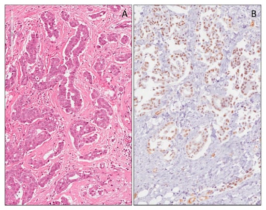 Several studies focused on immunohistochemical nuclear expression of WT1 in breast cancer, predominantly in the mucinous histotype [43,102,103,104], while it is occasionally co-expressed in non-mucinous carcinoma components of mixed mucinous carcinoma [102]. In addition, WT1 expression was observed, not only in mucinous carcinoma, but also in associated solid papillary carcinoma. A good correlation of WT1 immunohistochemical expression between solid papillary carcinoma and associated mucinous carcinomas does exist, indicating that the former could be the precursor of the latter [105]. With the advent of immunotherapy in malignancies, expression of WT1in mucinous breast carcinomas provides a molecular target in these relatively indolent breast tumors [102]. Conflicting results are reported regarding WT1 expression and the prognosis of breast carcinoma. A study demonstrated that WT1 expression in breast cancer is correlated to poor prognosis, due to cancer-related epithelial-to-mesenchymal transition (EMT) and poor chemotherapy response [106]. Conversely, another study displayed that the immunoreactivity for WT1, together with RSPO1 and P16, was significantly associated with a more favorable disease-free survival [107]. Furthermore, high levels of Wilms’ Tumor 1 (WT1) protein and mRNA had been associated with aggressive phenotypes of breast tumors, because HER2/neuoncogene increases WT1 expression. Increased levels of WT1 are due to the engagement of Akt, resulting in HER2/neu overexpression [108].