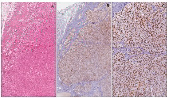 Several studies have investigated the expression of WT1 in Sertoli cell tumors in order to identify new diagnostic markers. Zhao et al. [99] suggested including WT1 protein (6F-H2 antibody) in the immunohistochemical panel, together with inhibin, to distinguish Sertoli cell tumors from endometrioid and neuroendocrine tumors. In addition, the authors stated that the diagnostic utility of WT1 in Sertoli cell tumors is similar to inhibin, and better than that of calretinin [99]. Another study evaluated WT1 expression in ovarian stroma and its tumors. The results showed that ovarian stromal cells, ovarian fibroma, cellular fibroma, fibrothecoma and ovarian leiomyoma expressed WT1, whereas non-gynecologic smooth muscle tumors and other spindle cell tumors were usually negative for WT1. These findings suggest that WT1 may be used as an immunohistochemical marker for spindle cell tumors derived from the ovary and uterus, including Sertoli cell tumors (Figure 5). WT1, SF-1 and inhibin are the most informative sex cord-stromal markers to be used for the distinction of non-sex cord-stromal tumors; however, the usefulness of immunohistochemistry for the diagnosis of fibroma/fibrothecoma is limited [100].