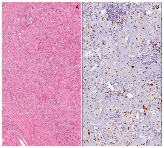 In most tumors, stromal differentiation, including smooth and skeletal muscle, bone and chondroid tissues, adipocytic tissue, or more rarely, neuroglia and mature ganglion cells, may be observed. Skeletal muscle in various stages of differentiation, including rhabdomyoblasts, represents the most common heterologous component [68,69]. The epithelial component is composed of tubules, papillary and glomerular-like structures, which are closely reminiscent of normal nephrogenesis.