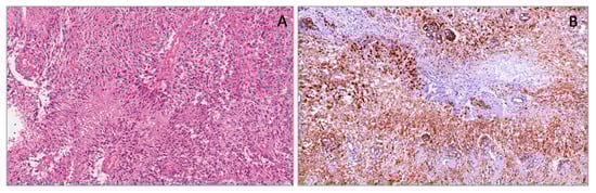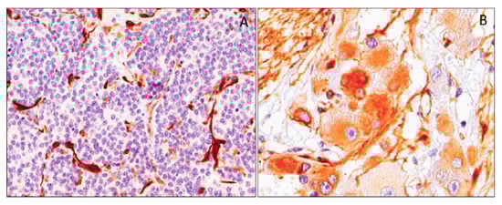 Vascular lesions are a heterogeneous group of tumors, including benign and malignant tumors, as well as malformations. Vascular tumors and malformations can be diagnostically challenging. Although they may initially appear very similar, they have distinct clinical courses and management. To provide a correct diagnosis, several studies have been conducted to identify immunohistochemical markers. Among the antibodies studied, interesting results have emerged from the study of WT1 cytoplasmic expression. Based on the studies available in the literature that compare vascular lesions, both benign and malignant, with malformations, it emerged that almost all benign lesions, such as capillary hemangioma, pyogenic granulomas, cherry angiomas and tufted angiomas, are WT1-positive, while lymphangioma and cavernous hemangioma are negative. Malignant tumors, such as angiosarcomas, hemangioendotheliomas and Kaposi’s sarcomas, are strongly WT1-positive (Figure 13). WT-1 expression in vascular malformations (angiokeratoma/verrucous hemangioma, combined vascular malformations, venous malformations, glomuvenous malformations, lymphatic malformations/lymphangioma, telangiectasia and targetoid hemosiderotic hemangioma) is generally completely negative or weak and focal positive. Interestingly, a strong and diffuse WT-1 staining was reported in a case of thrombosed vascular malformation with prominent endothelial hyperplasia [158,159,160]. WT1 expression in vascular tumors was also analyzed in fetal tissues, where a moderate to strong staining intensity in the cytoplasm of the endothelial cells of blood vessels was reported [37,52]. As WT1 staining has been obtained in the cytoplasm of embryonal/fetal endothelial cells, the reported cytoplasmic expression of this marker in many vascular tumors is not at all surprising.