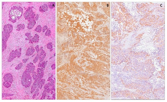 Wilms’ tumor is a malignant embryonal neoplasm, also known as a nephroblastoma of pediatric age, resulting from a disturbance of the differentiation of nephrogenic blastematous cells, which replicates various stages of the developing kidneys [53,54,63,64]. Microscopically, Wilms’ tumor is typically composed of three components: blastematous, mesenchymal (stromal) and epithelial [65,66,67]. Most Wilms’ tumors show all three components, but their proportions vary widely. Some tumors are biphasic, while others are monophasic. The blastematous component is extremely cellular and composed of small round-to-oval cells with scanty cytoplasm, dark nuclei and frequent mitotic figures, arranged in diffuse, nodular, cord-like (serpentine), or basaloid (with peripheral palisading) patterns. The stromal component is composed of spindle-shaped cells set in a myxoid stroma.
