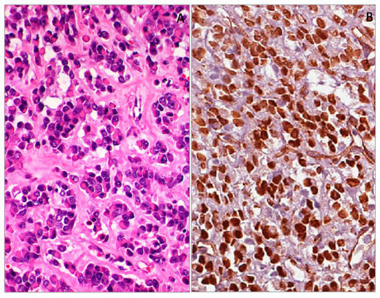 Malignant rhabdoid tumors are highly aggressive tumors that usually occur in the kidneys of children. Other sites are rarely affected, such as somatic soft tissues, liver, gastrointestinal tract, pelvis, retroperitoneum, abdomen, heart and central nervous system [138]. Interestingly, soft tissue localization prevails in fetuses, newborns and young children, while in adolescents, renal and nervous system sites, they are more frequent [138]. In some cases, tumors are metastatic at presentation and have a fatal course [138]. Histologically, they show solid or trabecular growth patterns composed of round/epithelioid to polygonal cells. Typically, neoplastic cells have abundant, deeply eosinophilic cytoplasm with a paranuclear eosinophilic, PAS-positive inclusion and large, round, vescicular nuclei with finely dispersed chromatin, containing a prominent eosinophilic nucleolus. Mitoses and necrosis are commonly seen. In some cases, minor tumor components consisting of smaller, round, undifferentiated cells with a scant cytoplasmic rim may be present or even prominent. Similarly to desmoplastic small round cell tumors, malignant rhabdoid tumors exhibit polyphenotipic profiles, with variable co-expression of different markers, including vimentin, cytokeratins, epithelial membrane antigen (EMA) and CD99 [138]. However, the complete absence of nuclear immunoreactivity for INI1 protein is the most useful diagnostic clue [139,140,141,142]. Tumors can express additional markers, such as muscle specific actin, alpha-smooth muscle actin, S100 protein, synapthophisin, and CD56. Occasionally, WT1 (clone WT-C19) can be expressed at nuclear or nucleo-cytoplasmic levels (Figure 9) [33,34,138]. We have experience of similar results also by using antibodies against the N-terminal portion (clone WT 6F-H2) [143].
