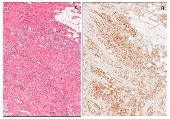Myofibroblastomais a rare, benign tumor composed of both fibroblastic and myofibroblastic cells [161,162,163], which localizes typically in the breast [163], vulvovaginal region [164,165] and soft tissues. It is composed of a proliferation of bland-looking spindle-shaped cells to epithelioid cells set in a predominant fibrous stroma. When the epithelioid cell component predominates, the myofibroblastoma is referred to as “epithelioid”. It was observed that WT1 expression is limited to epithelioid-type myofibroblastoma, while all other variants (classic-type, collagenized/fibrotic-type, myxoid-type, lipomatous-type and palisaded/Schwannian-like) are completely negative [40]. Indeed, all cases reported of epithelioid-type myofibroblastomas exhibited a diffuse and strong WT1 cytoplasmic expression. In the evaluation of small breast biopsies, WT1 is an important marker, together with desmin, alpha-smooth muscle actin, Myogenin, MyoD1, h-caldesmon, S-100 protein, HMB45, EMA, Pancytokeratins and CD34, which are helpful in the differential diagnosis of lesions with epithelioid morphology.