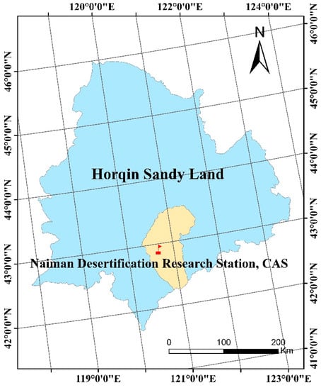 The experiment was carried out at the Naiman Desertification Research Station of the Chinese Academy of Sciences (42°58′ N, 120°43′ E; 360 m a.s.l.) in April–September 2017, located in the eastern part of Inner Mongolia Autonomous Region, China (Figure 1). Naiman, located in the southwest of Horqin Sandy Land [], has a semiarid continental monsoon climate. The experimental site, with sandy soil texture sensitive to wind erosion, has a mean annual precipitation of approximately 360 mm (265 mm in this growing season), an annual mean evaporation of around 1950 mm, and an annual mean temperature of 6.40 °C, of which the minimum monthly average temperature of −13.50 °C occurred in January and the maximum of 23.80 °C in July. In the soil depth of 0–60 cm, soil organic carbon content, pH (1:2.5 water), and electrical conductivity (1:5 water) at 0–30 cm depth before planting are 2.48 g kg−1, 9.23, 62.73 μS cm−1, respectively. Field capacity was 12.77%, wilting point was 5.40%, water saturation was 30.24%, saturated hydraulic conductivity was 0.93 mm min−1, as well as bulk density being 1.55 g cm−3.