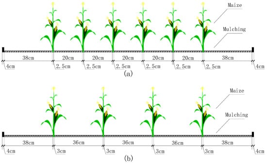 In each treatment, zonal micro-spray irrigation was used. Maize plants were supplied with 500 mm of water, including irrigation and precipitation, during the entire growth season. The irrigation amount was the total water supply minus precipitation. The maize growth season was divided into five stages: seeding, jointing, heading, filling, and ripening. According to the water requirements of maize at each growth stage, 15%, 35%, 22%, and 28% of the total water supply was applied to the seedling-jointing, jointing-heading, heading-filling, and filling-ripening stage, respectively []. The irrigation level was the same across all treatments. In each growth phase, if the precipitation exceeded the upper limit of the designed water supply, the water increment needed to be subtracted from the next irrigation, ensuring the same total water supply for all treatments throughout the entire growing season. Maize was irrigated on days with no or low wind (<1.5 m s−1) to achieve uniform irrigation. Irrigation regimes are summarized in Table 1. Spray lines (42 m) were installed in the middle of the plot along the east–west direction, with a nozzle spacing of 50 cm and discharge rate of 1 L h−1. Irrigation groundwater was measured continuously using flowmeters.