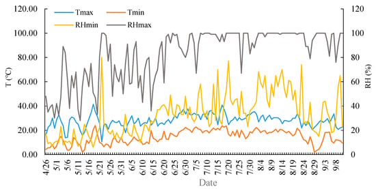 Variation of the temperature and relative humidity of the experimental site during the growth period of maize. Note: Tmax represents the maximum of temperature; Tmin represents the minimum of temperature; RHmax represents the maximum of relative humidity; RHmin represents the minimum of relative humidity.