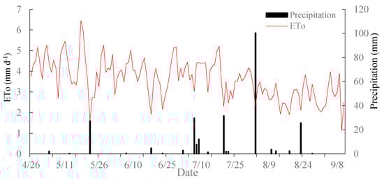 Variation of the reference crop evapotranspiration and precipitation during the growth period of maize. Note: ETo represents reference crop evapotranspiration, mm. ETo was calculated by means of the FAO Penman–Monteith Equation (2) for the entire growth season of maize.