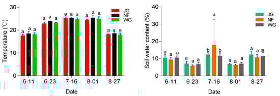 Soil temperature (soil layer of 0–20 cm) and soil water content (soil layer of 0–100 cm) of maize at different growth stages. Note: JG represents straw mulching; NF represents organic fertilizer mulching; WG represents no mulching; data represents mean ± standard error (n = 17). Bars labeled with different letters (lowercase) differed significantly among the treatments (p <0.05).