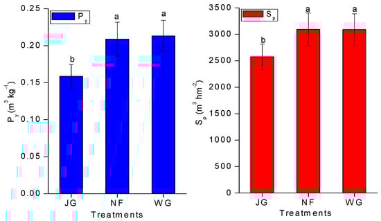 Values of Py and Sp of maize in the JG treatment were significantly lower than those in the NF and WG treatments. Compared with the JG treatment, values of Py and Sp were significantly higher by 31.73% and 34.51%, respectively, in the NF treatment and by 20.21% and 20.08%, respectively in the WG treatment (p <0.05); however, no significant differences were detected in Py and Sp between the NF and WG treatments. Thus, under micro-spray irrigation, Py and Sp of maize in various treatments were in the order: NF and WG >JG (Figure 6).