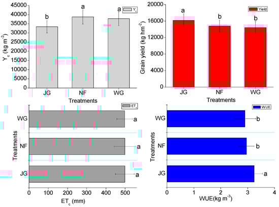 The JG treatment showed the lowest ETc and the highest yield and WUE (Figure 7); however, no significant differences were detected in these parameters between the NF and WG treatments. The value of ETc was essentially the same in JG, NF, and WG treatments. Values of Yc in the NF and WG treatments were 16.18% and 13.32% higher than those in the JG treatment, respectively (p <0.05). However, maize yield in the JG treatment was 9.53% and 12.10% higher than that in the NF and WG treatments (p <0.05). In the current study, ETc was approximately 500 mm in the JG, NF, and WG treatments during the entire growth season; no significant differences were detected among them, probably because of the thickness of maize straw in the JG treatment and organic fertilizer in the NF treatment, which requires further investigation. Moreover, this difference was closely related to differences in the region, maize variety, and irrigation approach.