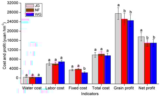 Cost and profit of maize under various mulching planting patterns. Note: JG represents straw mulching; NF represents organic fertilizer mulching; WG represents no mulching. The average local price for maize was 1.70 yuan kg−1. The total cost included the cost of seed, fertilizers, sows, micro-spray irrigation belts, water pipes, maize straw, organic fertilizers during the trial. Labor costs included the layout of the sample plot, weeding, sampling, irrigation, spreading fertilizer, and determination of sample. Bars labeled with different letters (lowercase) differed remarkably among different indexes (p <0.05).