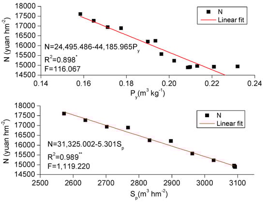 Relationships between water saving potential and net economic profit of maize. Note: N represents net economic profit, yuan hm−2; Py represents water saving potential per yield, m3 kg−1; Sp represents water saving potential per unit area, m3 hm−2. * represents regression effect was significant; ** represents regression effect was remarkably significant.