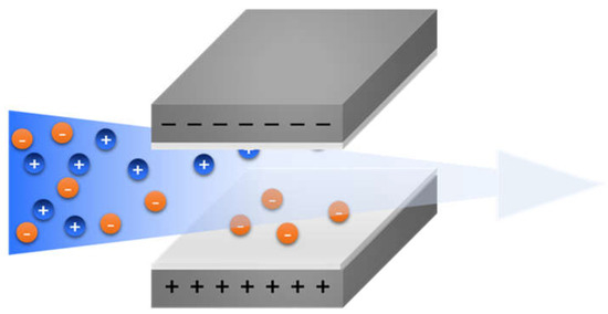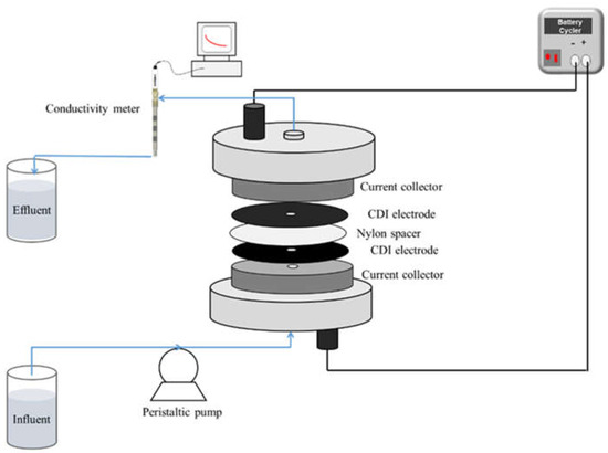 Capacitive deionization (CDI) is considered as a promising desalination technology because of its environmental benign and energy-efficient characteristics. In a typical CDI system, while the feed water passes through the porous carbon electrodes, ions in the feed water are captured on the electrodes when a potential is applied between the electrodes shown in Figure 1. The water desalination process of CDI is based on the principle of the electrical double layer capacitor (EDLC), and ions in feed water are removed by the electrical adsorption onto the surface of the electrodes [1,2,3,4,5,6,7,8,9,10,11].