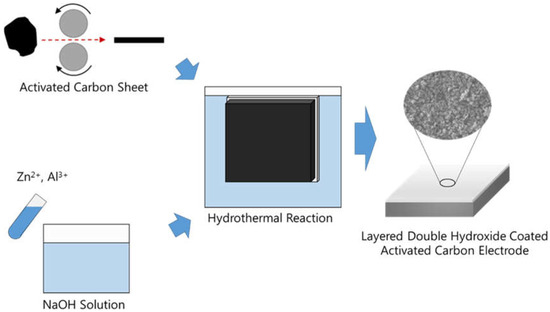The LDH coating process on the activated carbon electrode is shown in Figure 2. The LDH precursors were prepared by a method similar to that showed in the previous study [24]. Briefly, 60 mL of aqueous solution containing Zn (COOH)2·2H2O (0.2 M) and Al(NO3)3·9H2O (0.1 M) were mixed with 240 mL of NaOH solution (0.15 M) under vigorous stirring at room temperature for 1 h. The resulting solution was then rinsed with deionized water using a centrifuge to remove any remaining ions from the LDH precursor and re-dispersed in 300 mL of deionized water. For the LDH coating on the surface of the activated carbon electrode, the prepared activated carbon electrode was sealed on one side by a Teflon plate and immersed vertically in the prepared LDH precursor solution. Then, it was hydrothermally treated at 70 °C for 18 h in an oven. Finally, the LDH coated electrode was washed with deionized water several times and dried in vacuum oven at 60 °C for 12 h.