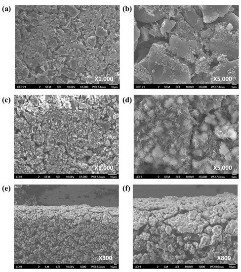 Figure 4 shows the surface images of the uncoated activated carbon ((a) and (b)) and LDH coated carbon electrode ((c) and (d)) using FESEM. As shown in Figure 4c,d, the LDH structures were aligned vertically on the surface of the activated carbon electrode, resulting in a porous LDH layer. The LDH coating layer was obtained under a hydrothermal reaction with an in situ growth method for better LDH crystal porous structure without blocking the pores on the surface of the activated carbon powder. During this coating process, the LDH nanosheets in the LDH precursor were attached onto the surface of the substrate and quickly formed a thin LDH film. After that, larger LDH particles began to grow and crystalize on top of the primary LDH film under the hydrothermal condition gradually forming a porous and well-oriented LDH layer. It was observed that the one side of the activated carbon electrode surface was well coated with the LDH layer with a depth of approximately 50 μm (verified by the cross-sectional SEM images in Figure 4e,f. The detailed mechanism of the porous LDH layer formation from the LDH precursor has been reported in previous [24].