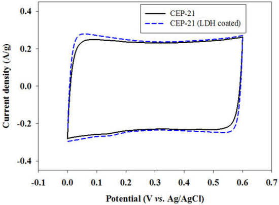 Figure 6 shows the cyclic voltammetry (CV) curves for the uncoated and LDH coated activated carbon electrodes with a potential range of 0–0.6 V in 1 M NaCl solution. Both CV curves are nearly rectangular in shape, showing that the ions are adsorbed onto the surface of both uncoated and LDH coated electrodes by forming an electrical double layer as ideal capacitors [6,28]. The specific capacitance of the LDH coated activated carbon electrode calculated by Equation (1) was 124 F/gelectrode, which shows a slightly increased (6%) value compared with that of the uncoated activated carbon electrode (116 F/gelectrode). These results indicate that the LDH coating layer improves the wettability of the electrode without disturbing the pore structure in the activated carbon, and this enhancement of the wettability is attributed to the increase in the capacitance.