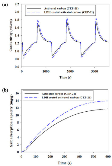 Furthermore, Figure 7a,b shows the conductivity changes during the ion adsorption/desorption tests and the salt adsorption capacity curves during the third charging step. As seen in Figure 7a, the conductivity rapidly decreased as an electrical potential (1.2 V) was applied during the charging step, while, it increased as the adsorbed ions were released during the discharging step. From the conductivity data, it was observed that the LDH coated activated carbon electrode had a better performance than that of the uncoated activated carbon electrode for overall cycles. Figure 7b shows the accumulated salt adsorption capacity during the third cycle of the charging step. Note that the salt adsorption capacity was expressed as the accumulated mass of adsorbed ions per total mass of the electrodes. The calculated salt adsorption capacity of the LDH coated activated carbon electrode was 13.9 mg/gelectrode, which showed a better desalination capacity than the uncoated activated carbon electrode (11.7 mg/gelectrode). Also, the value was a comparable with that of the commercially available activated carbon materials as shown in Table 1 [29]. This enhanced salt adsorption capacity indicates the improvement of the wettability of the porous carbon electrodes because of a rapid ion transfer at the interface between the electrode and electrolyte [16,18]. In conclusion, the hydrophilic LDH layer on the activated carbon electrode increases the accessibility of ions into the pores resulting in an improved desalination performance of the CDI system.
