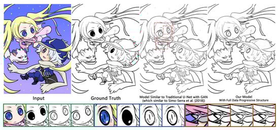 From the results in Figure 8, we can see that the outputs in the control group had more faults than the outputs generated by our model. Our lines were clear.er Our model and the models we compared had the same training database, but had different understanding of the lines. The results showed that our model correctly removed the dark area and reserved the lines around it. The model recognized by itself that we only needed the lines, but the model without a progressive structure may regard the black as some kind of very bold lines.