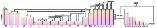 The ability of convolutional neural networks has been demonstrated by many papers. Our network structure explored several popular network structures. The fully convolutional network (FCN) provides the idea of up-sampling convolution, making it possible for the convolutional neural network to deal with the pixel-wise problems. At the same time, U-Net uses the connection method to merge convolution layers with different resolutions and obtain more convolutional information. ResNet [31] provides ideas on how to connect more information effectively. Finally, the generative adversarial net (GAN) [32] was added to our network structure. In our network structure, GAN only used an unverified structure to assist the system. Therefore, it could not completely find the effect of GAN on the entire system and only ensured that the entire system could work well. If we did not add GAN, there may have been some noise. The GAN’s main role here was to make the output style approach the style of the ground truth. The final output processed with GAN and without GAN results had its advantages and disadvantages, and one may choose whether to add it according to the actual requirements. Finally, we had our current network structure, a progressive and hierarchical U shaped neural network. Its global schematic diagram is shown Figure 2.