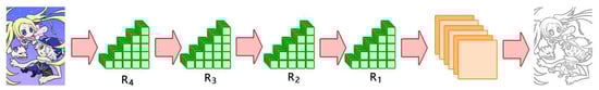 Our system’s input was a color image with alpha channel , which presented the original anime-style illustration. The output of the system was , which was the line extraction result. Our CNN model is specified in Figure 2, and parameterized by , trained to minimize the object function in Equation (1) with database D, which contained the source illustrations and the corresponding line extraction outputs. The loss function calculated in Equation (2) describes the accuracy of our model.
