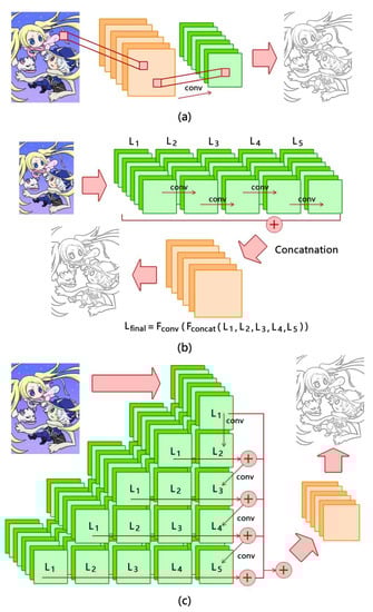Line extraction is one of the important topics in computational manga. There has been a certain number of papers published in recent years. Mao et al. [10] proposed an approach to extract lines based on regions for cartoons. Li et al. [11] removed the halftone screen and extracted manga structural lines from black-white manga with CNNs. Their network structural features were similar to that of U-Net [12], and they emphasized the establishment of a targeted training database, which would include targeted patterns. Liu et al. [13] developed a clear cartoon sketch simplification algorithm for sketch simplification with closure aware features.