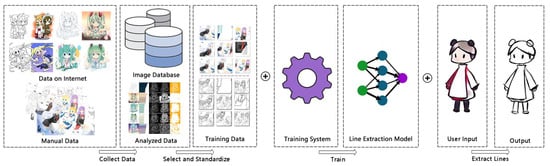 The neural network of the training system adopted our proposed progressive full data convolutional neural network. According to different training datasets, we could complete the extraction of line drawings for different types of images. Here, we mainly chose anime-style illustration data for testing, because the patterns of anime-style illustrations are similar. General users could extract lines by using the line extracting model for getting outputs automatically. Usually, users did not need to train the model by themselves. If there were specific requirements, then users could re-select the training dataset and re-train the corresponding model. Users only needed to adjust the output of the existing model and input the adjusted result into the data collector to regenerate the training dataset. Then, an updated model could be generated by re-training.