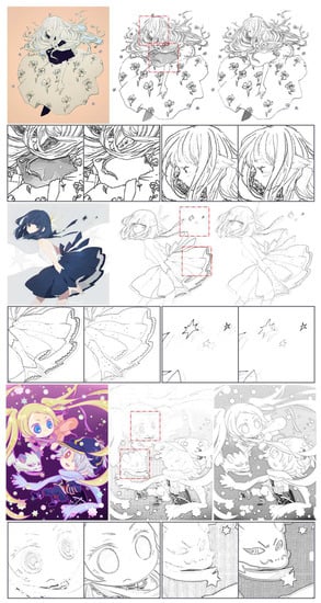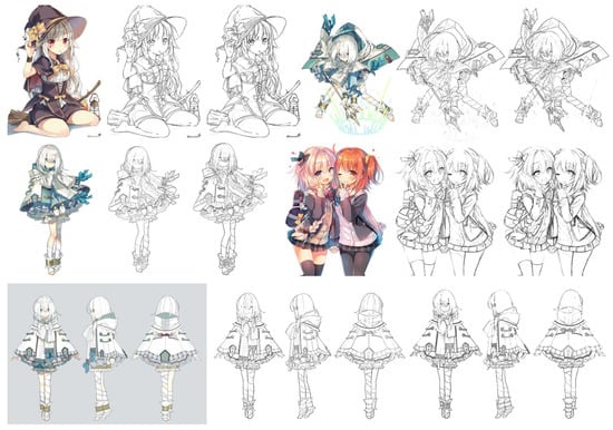 - Li, C.; Liu, X.; Wong, T.T. Deep Extraction of Manga Structural Lines. ACM Trans. Graph. (TOG) 2017, 36, 117. [Google Scholar] [CrossRef]
