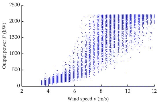 In this paper, wind speed v and output power P are used as examples, and a scatter plot of the relationship between wind speed and wind turbine output power is shown in Figure 2.