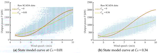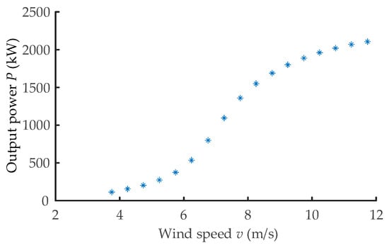where, are constants that depend on the unit structure and control mode; and n is the polynomial fitting order. A larger n tends to yield better fitting accuracy. However, if the fitting order is too high, the computation time will increase, and numerical stability may become problematic, yielding a worse fit. Using the bin processed data relation graph and the physical and mechanical principles between the corresponding parameters, a reasonable fitting order can be selected. For example, the relationship between wind speed and wind turbine output power can be considered to be third order [].